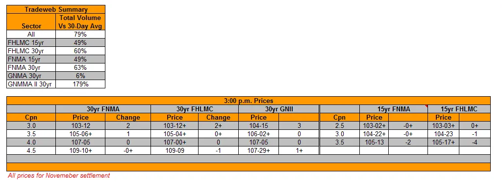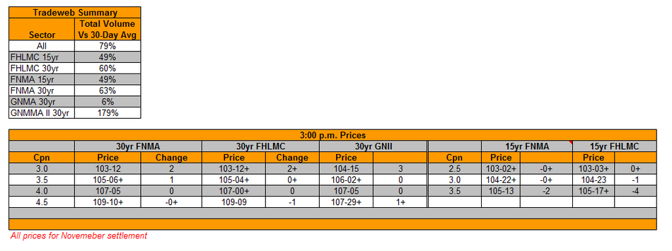 MBS CLOSE: Buying binge aids lower coupons; vol hit in tight range trade
